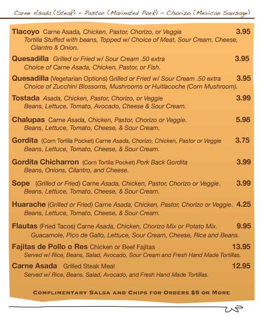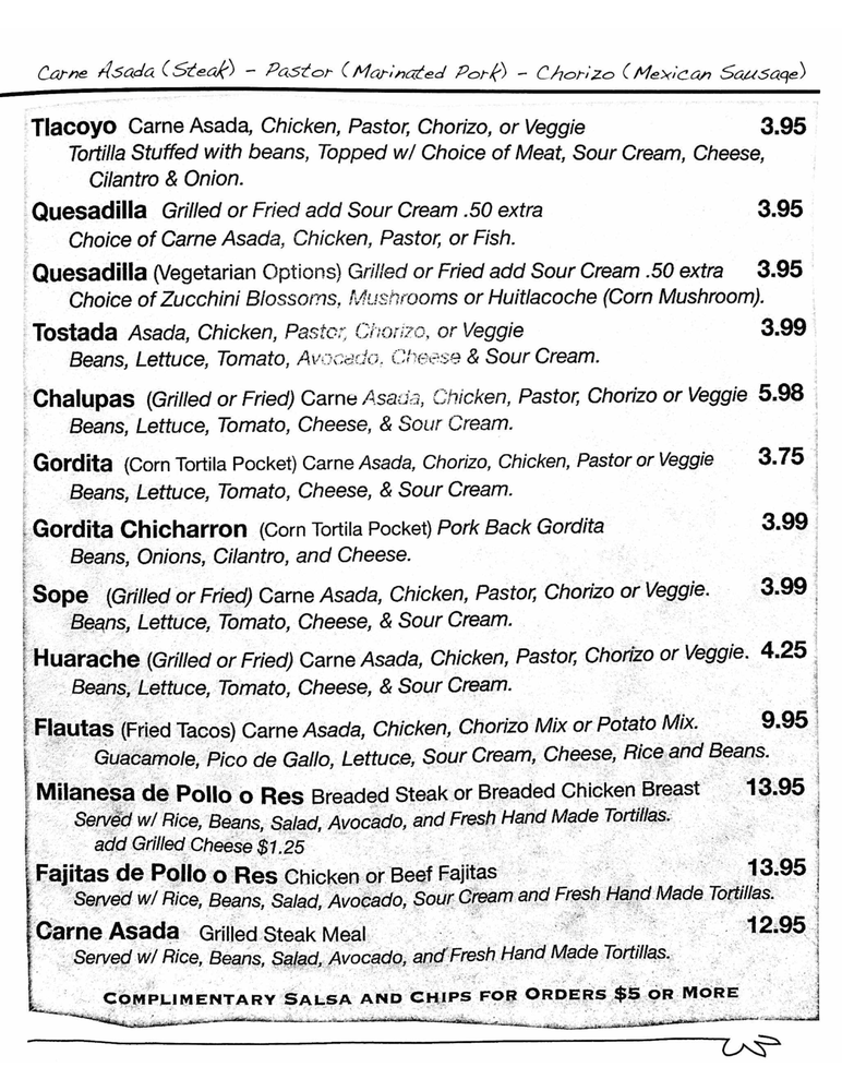 A fresh organic handmade tortilla topped with grilled cheese, your choice of protein, onion and cilantro. One of the favorites!!!!