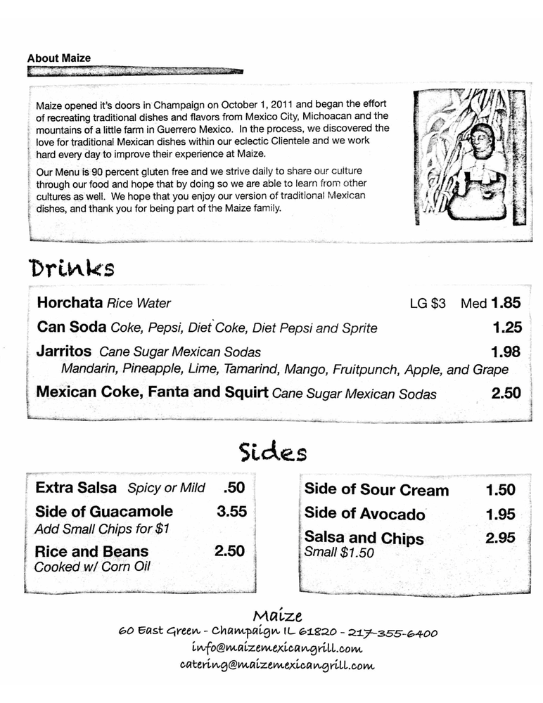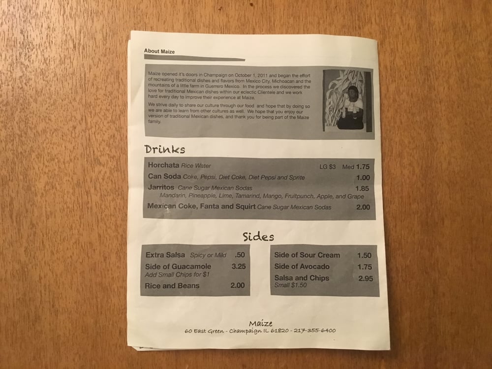 Maize Mexican Grill stands out in the Mexican food scene with its no-frills charm and delicious offerings. Located at 60 E Green St in Champaign, IL, this casual restaurant is perfect for lunch or dinner. Their menu boasts a variety of options, including appetizers like the flavorful Guacamole and Queso Fundido. Their Tacos are a must-try, with choices like the Taco Mexica stealing the spotlight. The Burritos, especially the ones with unique fillings like Zucchini Blossoms and Corn Mushroom, are also crowd favorites. Customers rave about the mouthwatering dishes, with mentions of exceptional flavors and generous portion sizes. With a focus on quality ingredients and attentive service, Maize Mexican Grill is a must-visit for anyone craving authentic Mexican cuisine.